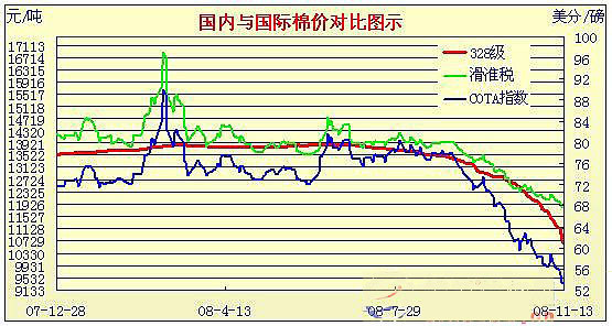 08年8月29日-08年11月13日國(guó)內(nèi)外棉價(jià)對(duì)比圖表