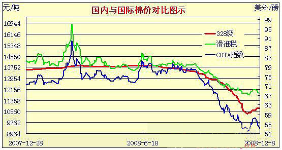08年10月31日-08年12月8日國內(nèi)外棉價(jià)對(duì)比圖表