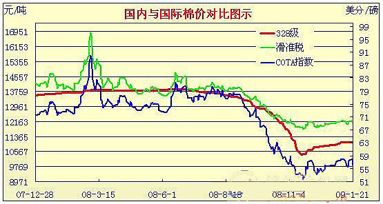 08年11月28日-09年1月21日國內(nèi)外棉價(jià)對比圖表