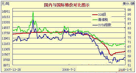 08年10月31日-09年1月5日國(guó)內(nèi)外棉價(jià)對(duì)比圖表