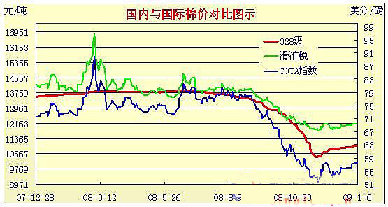 08年10月31日-09年1月6日國內(nèi)外棉價(jià)對(duì)比圖表