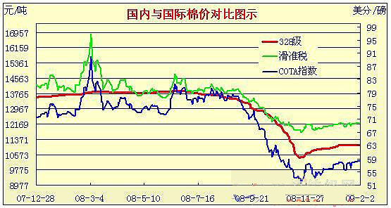 08年12月31日-09年2月2日國(guó)內(nèi)外棉價(jià)對(duì)比圖表