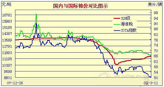 09年2月2日-09年3月11日國(guó)內(nèi)外棉價(jià)對(duì)比圖表