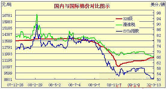 09年2月2日-09年3月13日國內(nèi)外棉價(jià)對比圖表