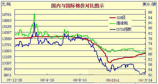 09年2月2日-09年3月24日國內(nèi)外棉價(jià)對(duì)比圖表