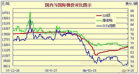 09年2月2日-09年3月26日國(guó)內(nèi)外棉價(jià)對(duì)比圖表