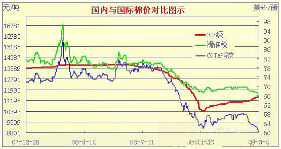 09年2月2日-09年3月4日國內(nèi)外棉價(jià)對比圖表