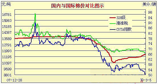 09年2月2日-09年3月5日國內(nèi)外棉價(jià)對(duì)比圖表