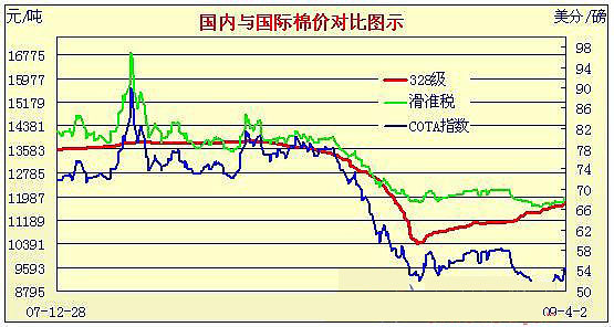 09年3月2日-09年4月2日國內(nèi)外棉價對比圖表