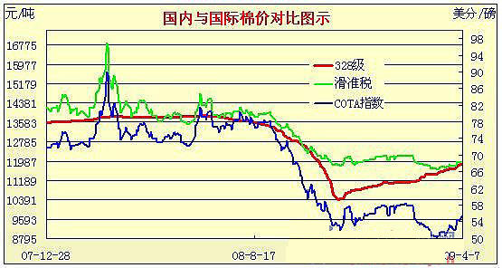 09年3月2日-09年4月7日國(guó)內(nèi)外棉價(jià)對(duì)比圖表
