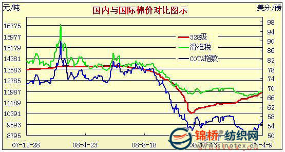 09年3月2日-09年4月9日國內(nèi)外棉價對比圖表