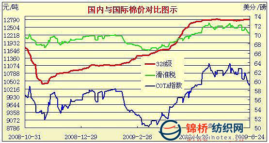 09年3月2日-09年6月24日國內(nèi)外棉價對比圖表