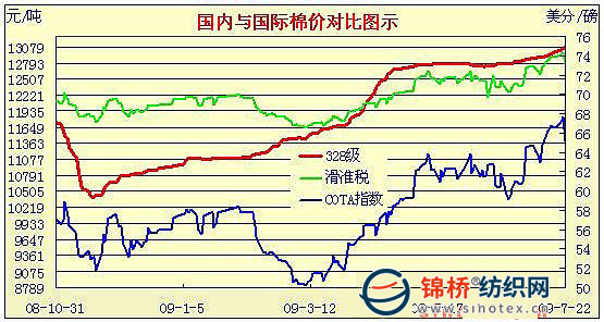 錦橋紡織網(wǎng)—資訊頻道> 棉花信息> cotlook>正文 國內(nèi)外棉價對比圖表(6月1日-7月22日)