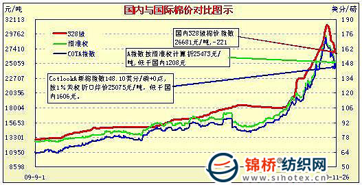 錦橋紡織網(wǎng)—資訊頻道> 棉花信息> cotlook>正文 國內(nèi)外棉價對比圖表(11.1-11.26)