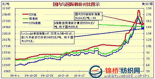 錦橋紡織網(wǎng)—資訊頻道> 棉花信息> cotlook>正文 國內(nèi)外棉價對比圖表(11.1-12.1)