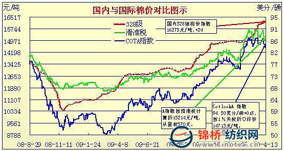 錦橋紡織網(wǎng)—資訊頻道> 棉花信息> cotlook>正文 國內(nèi)外棉價對比圖表(2.26-4.13)