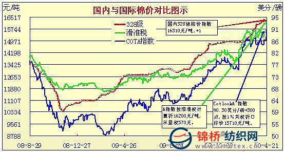 錦橋紡織網(wǎng)—資訊頻道> 棉花信息> cotlook>正文 國內(nèi)外棉價對比圖表(2.26-4.21)