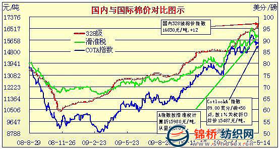 錦橋紡織網(wǎng)—資訊頻道> 棉花信息> cotlook>正文 國內(nèi)外棉價對比圖表(4.16-5.14)