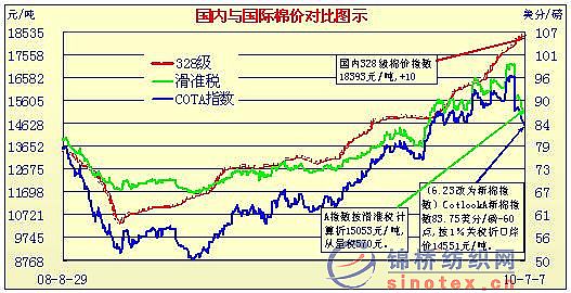 錦橋紡織網(wǎng)—資訊頻道> 棉花信息> cotlook>正文 國內(nèi)外棉價(jià)對比圖表(6.15-7.7)