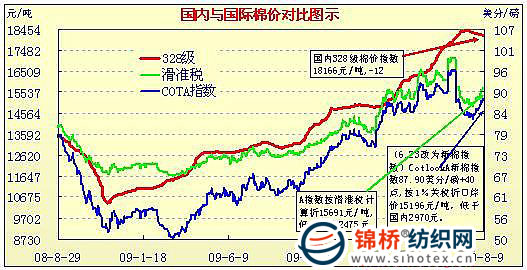 錦橋紡織網(wǎng)—資訊頻道> 棉花信息> cotlook>正文 國內(nèi)外棉價對比圖表(7.01-8.09)