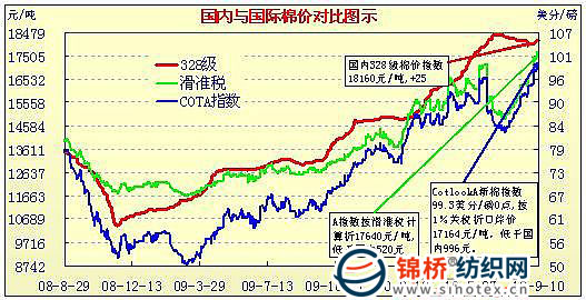 錦橋紡織網(wǎng)—資訊頻道> 棉花信息> cotlook>正文 國內(nèi)外棉價對比圖表(7.30-9.10)