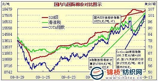 錦橋紡織網(wǎng)—資訊頻道> 棉花信息> cotlook>正文 國內(nèi)外棉價對比圖表——國際棉價破百(7.30-9.13)