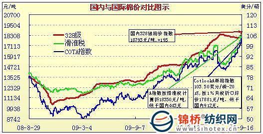 錦橋紡織網(wǎng)—資訊頻道> 棉花信息> cotlook>正文 國內(nèi)外棉價對比圖表(7.30-9.16)