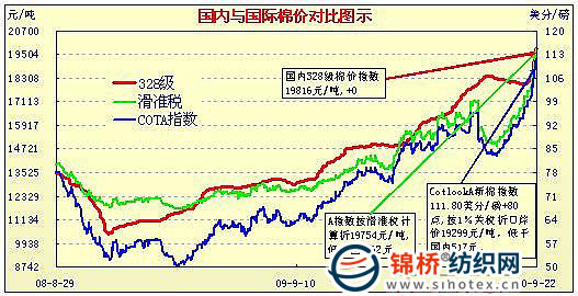 錦橋紡織網(wǎng)—資訊頻道> 棉花信息> cotlook>正文 國內(nèi)外棉價對比圖表(7.30-9.22)