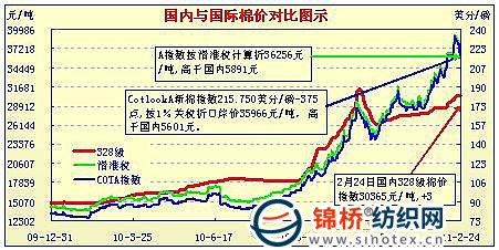 錦橋紡織網(wǎng)—資訊頻道> 棉花信息> cotlook>正文 國內(nèi)外棉價對比圖表(1.31-2.24)