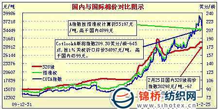 錦橋紡織網(wǎng)—資訊頻道> 棉花信息> cotlook>正文 國內(nèi)外棉價對比圖表(1.31-2.25)