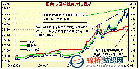 錦橋紡織網(wǎng)—資訊頻道> 棉花信息> cotlook>正文 國內(nèi)外棉價對比圖表(2.14-3.4)