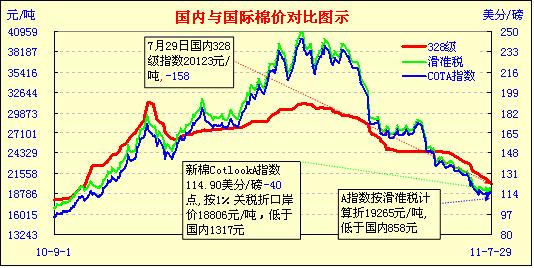 受棉價巨幅波動影響,紡織品銷售也日趨艱難。在銷售疲弱、資金短缺、需求下降、買漲不買跌心態(tài)等因素影響下,棉價繼6月份平穩(wěn)一個月后,7月份再度回復(fù)到下跌通道,7月份棉價平均以每天200元左右的價格呈梯字下滑,全月累計以下跌4000元/噸左右,為近幾個月來的最大跌幅。此前4月份跌3200元,5月份跌2500元,6月份微跌400元,4個月的時間,棉價從3萬元跌至2萬元,跌幅達(dá)33%以上。隨著新花年度的臨近,19800元的收儲價有望使棉價逐步止跌回穩(wěn)。美國本年度棉花市場結(jié)束,8月1日起開始新的棉花年度。回顧本年度國際棉價走勢,可謂走了一個大弧形,即暴漲暴跌行情,最后基本回歸到原點(diǎn)。在近幾個月的跌勢看,國際棉價呈兩個大階梯的大幅下調(diào),即Cotlook A指數(shù)在4月份由237美分/磅,下跌到172美分/磅,跌了65美分,一個月跌幅27%;7月份由136美分跌至114美分,跌22美分,跌幅16.2%。從4月至7月國際棉價累計下跌1.23美元/磅,跌幅達(dá)51%以上。由于國際棉價跌幅超過國內(nèi)棉價,6月中旬后,國際棉棉價逐步低于國內(nèi)棉價。