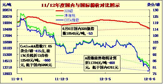 國(guó)內(nèi)外棉價(jià)對(duì)比圖表——兩日A指大幅下調(diào)(6-6)