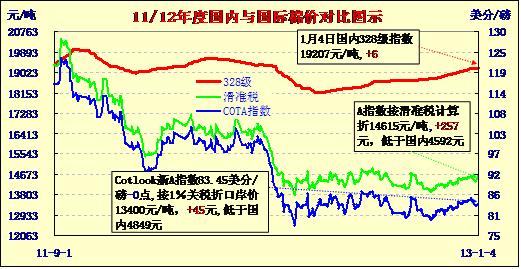 注:2013年,計(jì)算進(jìn)口棉滑準(zhǔn)稅的兩個(gè)常數(shù)調(diào)整(即常數(shù)Pt由8.23提高到8.87;另一常數(shù)由3.235%下調(diào)至2.908%)后,滑準(zhǔn)稅折口岸價(jià)大幅上升,在價(jià)格、匯率等條件同等情況下,滑準(zhǔn)稅折口岸價(jià)平均每噸提高200元左右,計(jì)算方法本身縮小了滑準(zhǔn)稅的內(nèi)外棉價(jià)差,同時(shí),這一提價(jià)因素當(dāng)由進(jìn)口企業(yè)買單。
