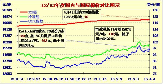 國內(nèi)外棉價(jià)對(duì)比圖表(13-4-4)