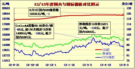 國(guó)內(nèi)外棉價(jià)對(duì)比圖表(13-6-3)