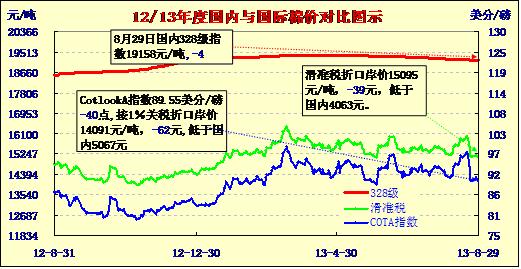 國(guó)內(nèi)外棉價(jià)對(duì)比圖表(13-8-29)