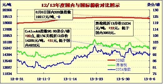 錦橋紡織網(wǎng)—資訊頻道> 棉花信息> cotlook>正文 國內(nèi)外棉價對比圖表(13-8-6)
