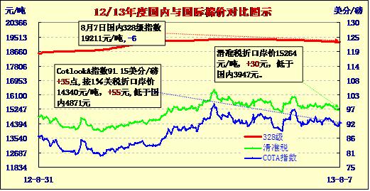 國(guó)內(nèi)外棉價(jià)對(duì)比圖表(13-8-7)