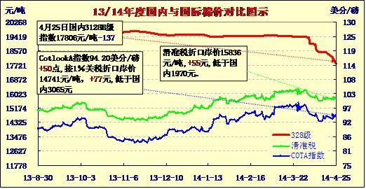 國(guó)內(nèi)外棉價(jià)對(duì)比——外漲內(nèi)跌價(jià)差縮小(04-25)