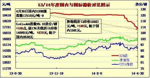 國(guó)內(nèi)外棉價(jià)對(duì)比圖表(04-30)