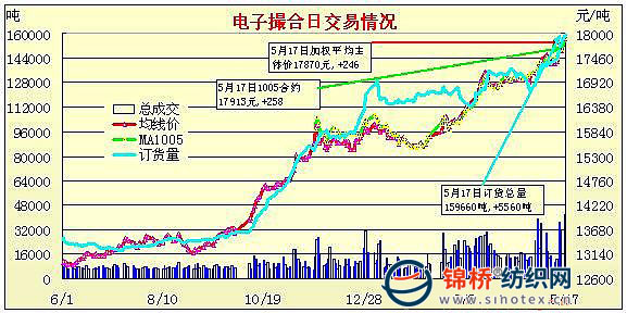 錦橋紡織網(wǎng)—資訊頻道> 棉花信息> 電子撮合>正文 電子撮合放量大漲逼近每噸1.8萬元(5-17)