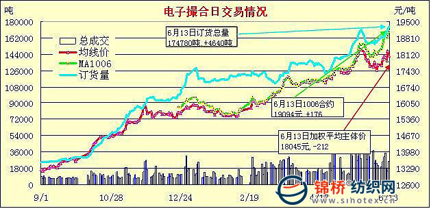 錦橋紡織網(wǎng)—資訊頻道> 棉花信息> 電子撮合>正文 電子撮合放量續(xù)漲6月合約漲至1.9萬元(6-13)