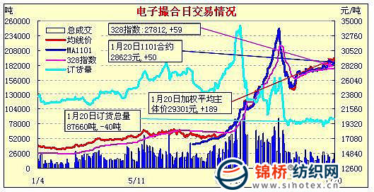 錦橋紡織網(wǎng)—資訊頻道> 棉花信息> 電子撮合>正文 電子撮合放量強(qiáng)勢收漲遠(yuǎn)期破2.9萬元(1-20)