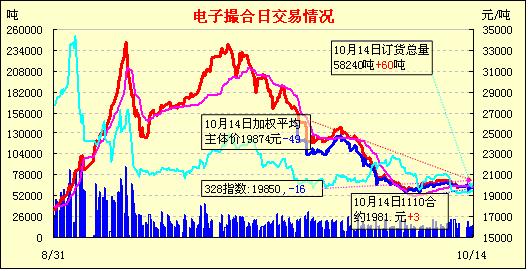 13日,受美國德州產(chǎn)量減少等利好因素支撐,紐約期棉全面收漲,主力1112月合約結(jié)算價101.56美分/磅,漲105點(diǎn),1203月合約結(jié)算價98.87美分/磅,漲89點(diǎn);外盤止跌上漲,14日撮合各合同開盤高低不一,之后多數(shù)合同行情震蕩頻繁,幅度較大,同時各合同走勢出現(xiàn)分化,尤其午盤之后呈現(xiàn)近強(qiáng)遠(yuǎn)弱格局,盤終各合同均價近漲遠(yuǎn)跌,幅度均在百元以內(nèi);近月MA1110合同收于19895元,漲85元,主力MA1201合同收于19760元,跌156元;盤內(nèi)最低價為MA1111合同收市價和MA1201合同盤中價19720元,最高價為MA1203合同開市價20125元;當(dāng)日成交量增加,訂貨量小增。