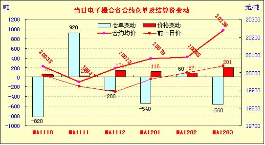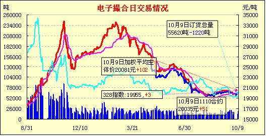 10月9日撮合各合同開盤近低遠高,之后近月合同震蕩走高,中遠月合同稍有回調(diào),不過整體走勢依然較強,尾盤多數(shù)合同表現(xiàn)強勢,收市時各合同均價全面收漲,遠月合同漲幅較明顯;近月MA1110合同收于20080元,漲96元,主力MA1202合同收于20120元,漲122元;盤內(nèi)最低價為MA1111合同開市價19700元,最高價為MA1203合同盤中價20345元;當日成交量增加,訂貨量減少。