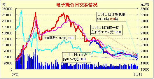 11月11日,全國棉花交易市場商品棉電子撮合交易成交12780噸,較上一日減少680噸,訂貨量增加20噸,累計(jì)訂貨59500噸。今日撮合各合同普遍高開,盤內(nèi)走勢多有震蕩,盤終跌多漲少。其中MA1204漲6元收于19690元,為今日唯一收漲合同,MA1112合同跌142元收于18800元,為今日跌幅之首,其余合同跌幅在85元以內(nèi)。盤內(nèi)最低價為MA1111合同盤中價18500元,盤內(nèi)最高價為MA1204合同開盤價19800元;當(dāng)日成交量小幅減少,訂貨量微增。