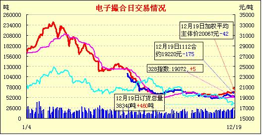 12月19日,全國(guó)棉花交易市場(chǎng)商品棉電子撮合交易成交20340噸,較上一日減少4040噸,訂貨量增加460噸,累計(jì)訂貨38340噸。今日撮合開盤各合同低開居多,之后各合同行情普遍震蕩,近中期合同弱勢(shì)為主,中遠(yuǎn)月合同尾盤呈現(xiàn)漲勢(shì),收市時(shí)各合同均價(jià)近跌遠(yuǎn)漲,近月合同跌幅較大;近月MA1112合同收于19280元,跌115元,主力MA1204合同收于20250元,漲55元;盤內(nèi)最低價(jià)為MA1112合同開市價(jià)19210元,最高價(jià)為MA1205合同盤中價(jià)20400元;當(dāng)日成交量減少,訂貨量增加。