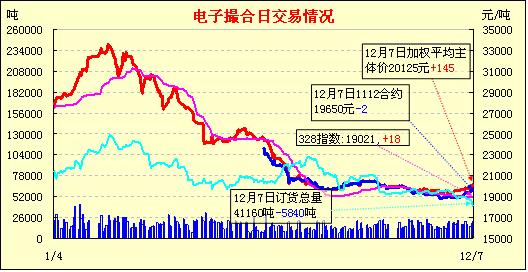 12月7日,全國棉花交易市場商品棉電子撮合交易成交20540噸,較上一日增加2520噸,訂貨量減少5840噸,累計訂貨41160噸。撮合中遠(yuǎn)月合同普遍高開,之后行情以震蕩上行為主,近中期合同表現(xiàn)較為疲軟,收市時各合同均價近跌遠(yuǎn)漲,遠(yuǎn)月漲幅仍在百元以上;近月MA1112合同收于19650元,跌2元,主力MA1204合同收于20180元,漲109元;盤內(nèi)最低價為MA1201合同開市價19500元,最高價為MA1205合同開市價20500元;當(dāng)日成交量續(xù)增,訂貨量大幅續(xù)減。