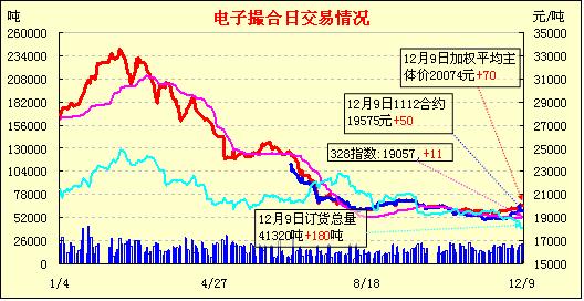 12月9日,全國棉花交易市場商品棉電子撮合交易成交20260噸,較上一日減少2040噸,訂貨量增加180噸,累計(jì)訂貨41320噸。撮合開盤高低不一,之后行情強(qiáng)勢震蕩為主,尾盤遠(yuǎn)月合同有回調(diào)趨勢,不過各合同均收漲,收市時(shí)各合同均價(jià)小幅收漲為主,漲幅多在50元以內(nèi);近月MA1112合同收于19580元,漲55元,遠(yuǎn)月MA1205合同收于20230元,漲8元;盤內(nèi)最低價(jià)為MA1112合同開市價(jià)19570元,最高價(jià)為MA1205合同開市價(jià)20295元;當(dāng)日成交量減少,訂貨量增加。